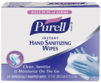 Purell Instant Hand Sanitizer WipesGojo Purell Hand Sanitizing Wipes Kills 99.9% of most common germsWorks in as little as 15 secondsNon-linting, durable wipe sanitizes hands while wiping away light soils and dirtTextured for superior cleaningConvenient, easy to use wipes are ideal for offices, restaurants, health clubs and more