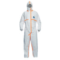 Tyvek Hooded Coveralls with Elastic Wrists and Ankles, 2X-Large, WhiteDuPont™ Tyvek Hooded Coveralls with Elastic Wrists and Ankles Hood shape follows head movements and supports mask fitChin flap for increased liquid protection and closer fit when wearing full face masksThumb loops prevent sleeves from riding upElastic face, cuffs, ankles and glued in elastic waist for…