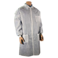 $76.351.5 oz polypropylene Three-layer SMS construction for added splash protection Collar, left breast pocket, two hip pockets Knit cuffs Snap front closure Available in white only