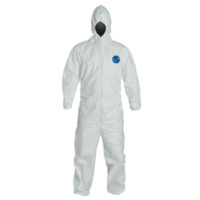 Tyvek Hooded Coveralls with Elastic Wrists and Ankles, 2X-Large, WhiteDuPont™ Tyvek Hooded Coveralls with Elastic Wrists and Ankles Hood shape follows head movements and supports mask fitChin flap for increased liquid protection and closer fit when wearing full face masksThumb loops prevent sleeves from riding upElastic face, cuffs, ankles and glued in elastic waist for…