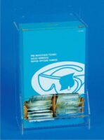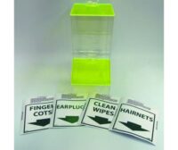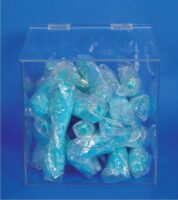 ACRYLIC, MISC DISPENSER WITH COVER, 11.25h x 6w x 9 dMATERIAL: ACRYLICLEGEND FRONT: FINGER COTS, EARPLUGS, CLEAN WIPES, HAIRNETS