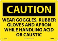 CAUTION, WEAR GOGGLES RUBBER GLOVES AND APRON, 10X14, .040 ALUMMATERIAL: ALUMINUM .040LEGEND FRONT: WEAR GOGGLES RUBBER GLOVES AND APRON WHILE HANDLING ACID OR CAUSTIC