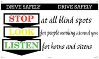 BANNER, DRIVE SAFELY STOP LOOK LISTEN, 3FT X 10FTMATERIAL: VINYL BANNERLEGEND FRONT: DRIVE SAFELY STOP LOOK LISTEN